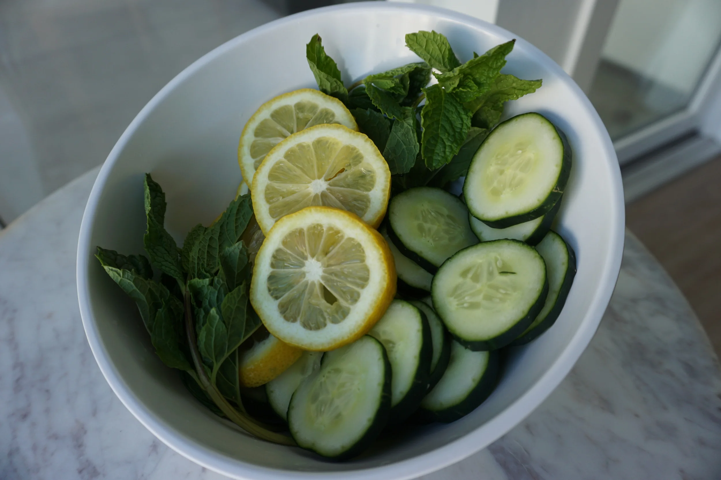 CUCUMBER - Hydrating, decreases swelling, irritation and inflammation to the skin, also protects your skin against the effects of aging, reduces bad breath, protects bones, maintains a healthy weight. (Source) (4 slices of cucumber in the bottle)